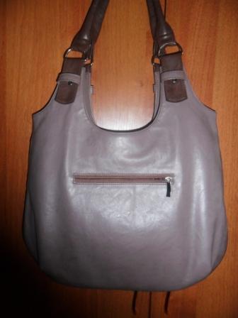 Сумка размером: высота 31 см, ширина 35 см,толщина 10 см.Производитель г.Москва, материал - искусственная кожа.Цвет светло-серый, материал с "цветами" напоминает замшу.С оборота сумки -карман на молнии.