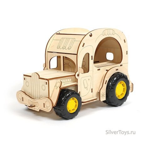 Деревянный конструктор фургон Крем-брюле состоит из 36 элементов. Конструктор собирается без клея. Капот и крыша фургона открываются. В набор входят также пластиковые колеса.