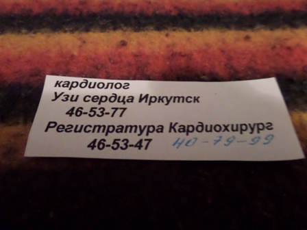 Направление еще не готово, нам сперва надо тут сдать анализы, сделать ЭКГ. Дали только номера телефонов в Иркутске, чтобы записаться к кардиохирургу и на УЗИ. Направляют в Областную больницу, микрорайон Юбилейный, 100.